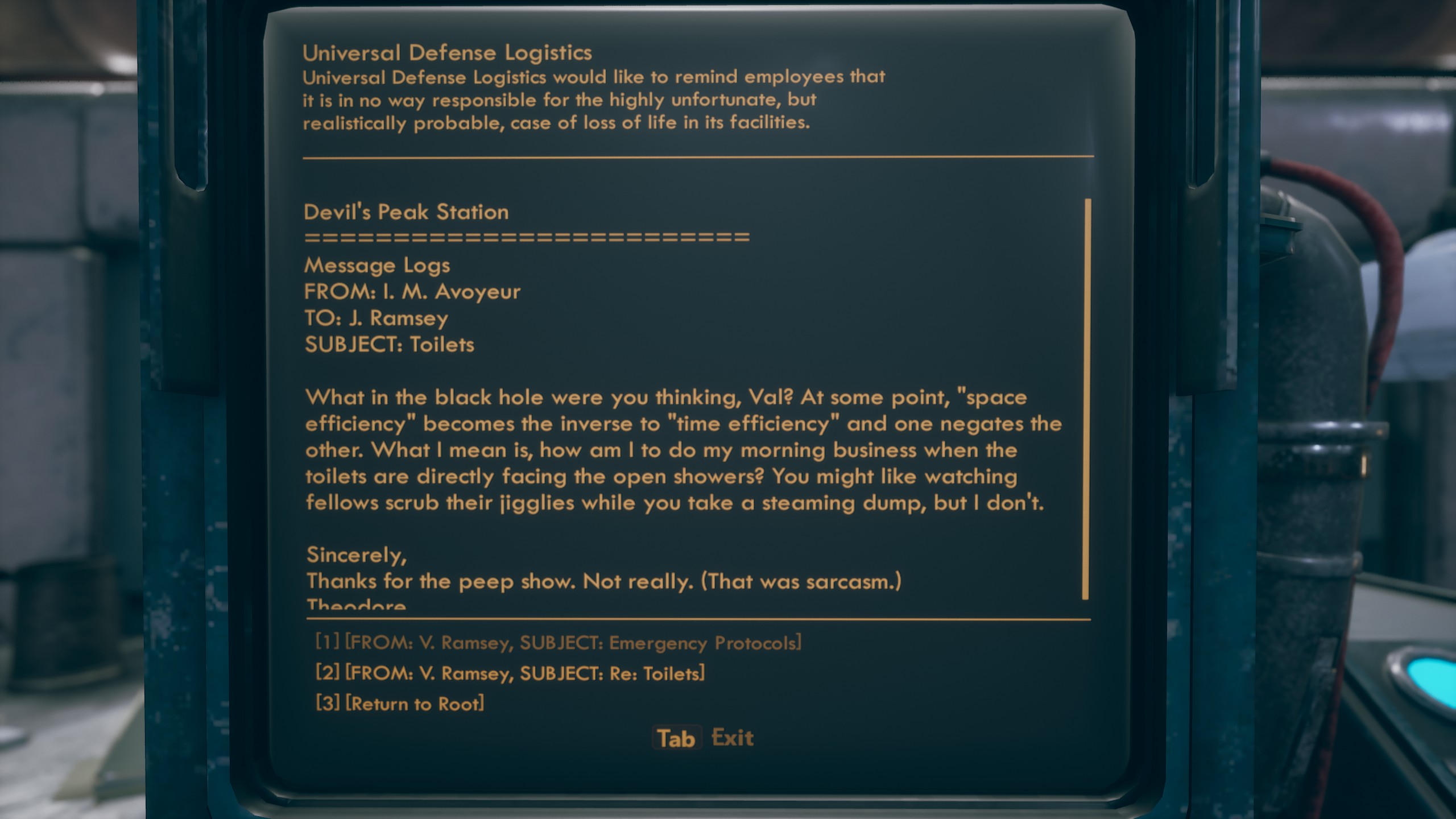 Dialogue is, to me at least, the best part of these games because that is the heart of the story: it’s about people, how they react to situations, and how you react to both them and the situation also. You can be a complete jackass and tell people off or even attack them in dialogue, you can be sarcastic, flirty, or even just play dumb. Important choices are made through dialogue, so if you’re the type that just goes “yeah ok” and clicks through all dialogue without listening to it or reading it, this probably is not the game for you. Even terminals can have hilarious things on them if you have the curiosity to check them, like this screenshot from one of the DLCs: